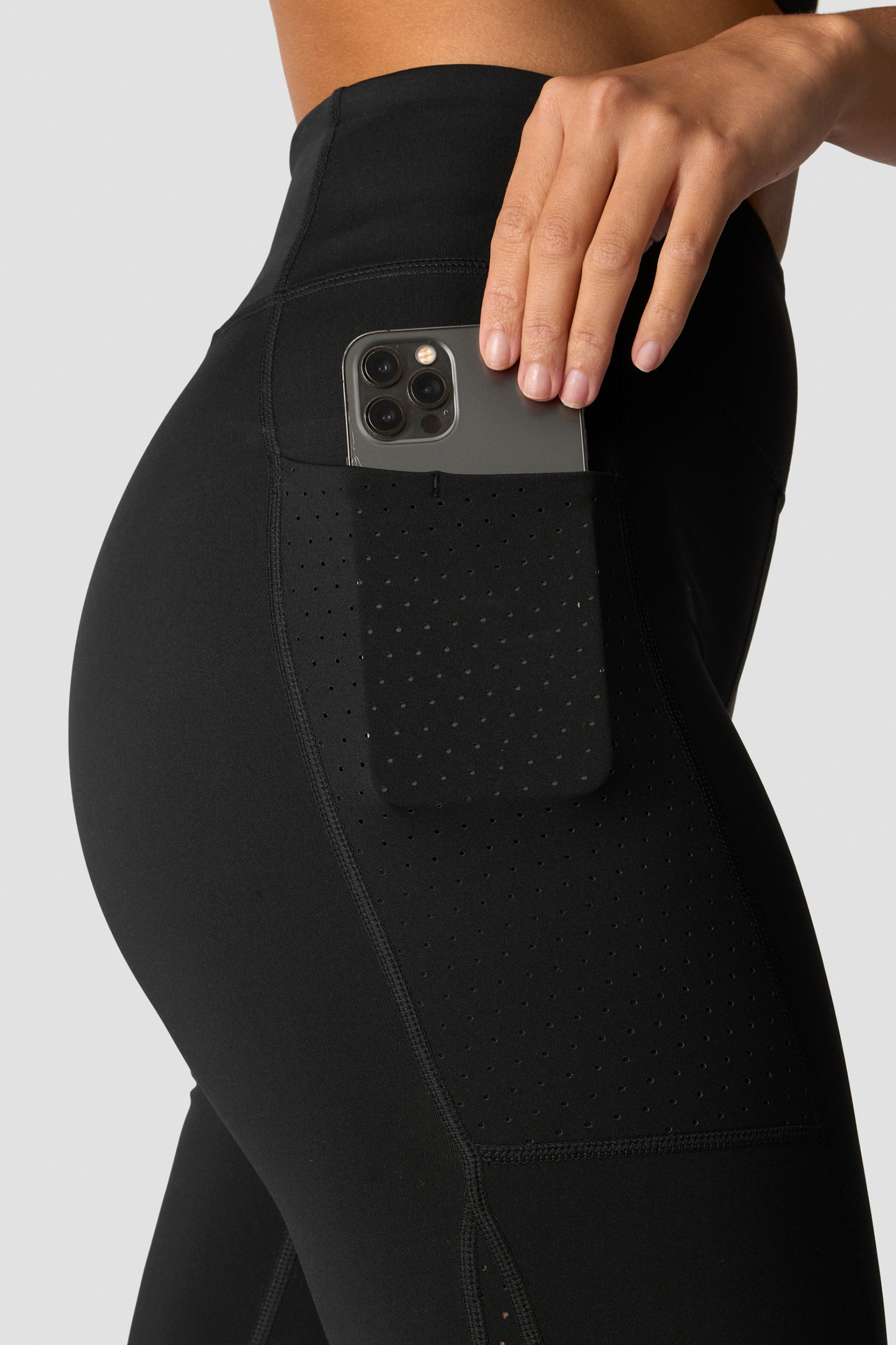 Pantaloni de alergare cu buzunare pentru telefon. Materialul este foarte elastisc, având proprietăți de transport al umidității și perforații tăiate cu laser pentru ventilație. Buzunarele laterale îți păstrează bunurile aproape. Elasticul subțire din talie menține leggings-urile fixe pe loc.