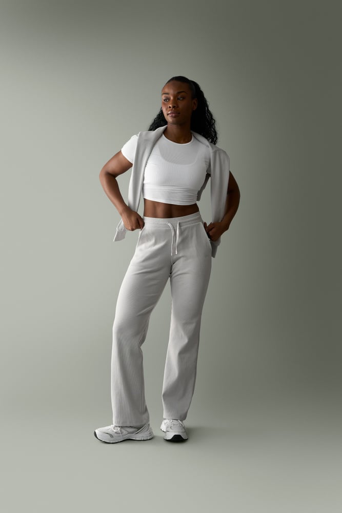 Pantaloni de lounge cu dungi. Recharge este o colecție de haine de lounge realizată dintr-un material ribat super moale cu o senzație netedă. Combină topurile și pantalonii confortabili pentru a-ți îmbunătăți ziua de odihnă și lasă-ți corpul să capete energie nouă. Pantaloni de lounge confortabili, perfecți, cu talie ajustabilă și buzunare.